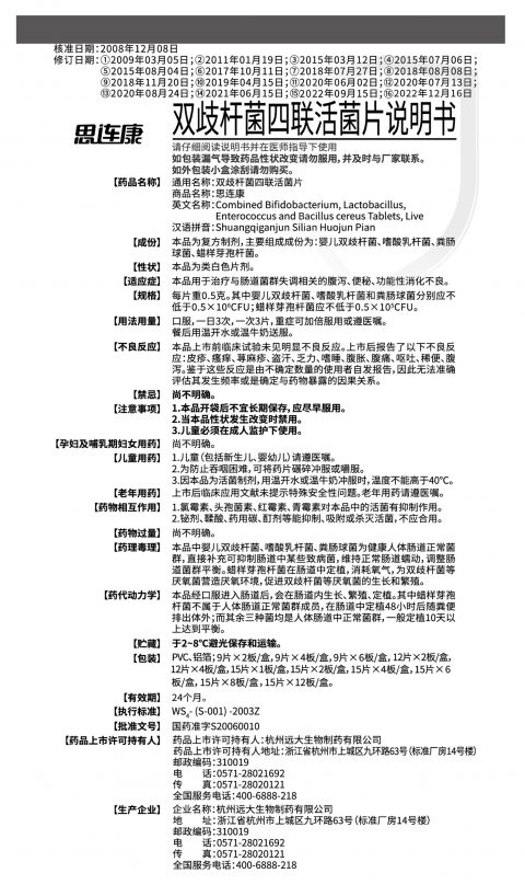 Transcript: Date of approval: December 08, 2008 Date of revision: (1) March 05, 2009; (2) 2011-01-19; (3) 2015-03-12; (4) 2015-07-06; (5) 2015-08-04; (6) October 11, 2017; (7) 2018-07-27; (8) 2018-08-08; (9) November 20, 2018; (10) 2019-04-15; (11) 2020-06-02; (12) 2020-07-13; (13) 2020-08-24; (14) 2021-06-15; (15) 2022-09-15; (16) December 16, 2022 Siliankang Bifidobacterium Quadruple Live Tablets Instructions Please read the instructions carefully and use them under the guidance of a physician If the packaging leaks and the properties of the drug change, do not take it, and contact the manufacturer in time. If the outer packaging box is scratched, please do not buy.