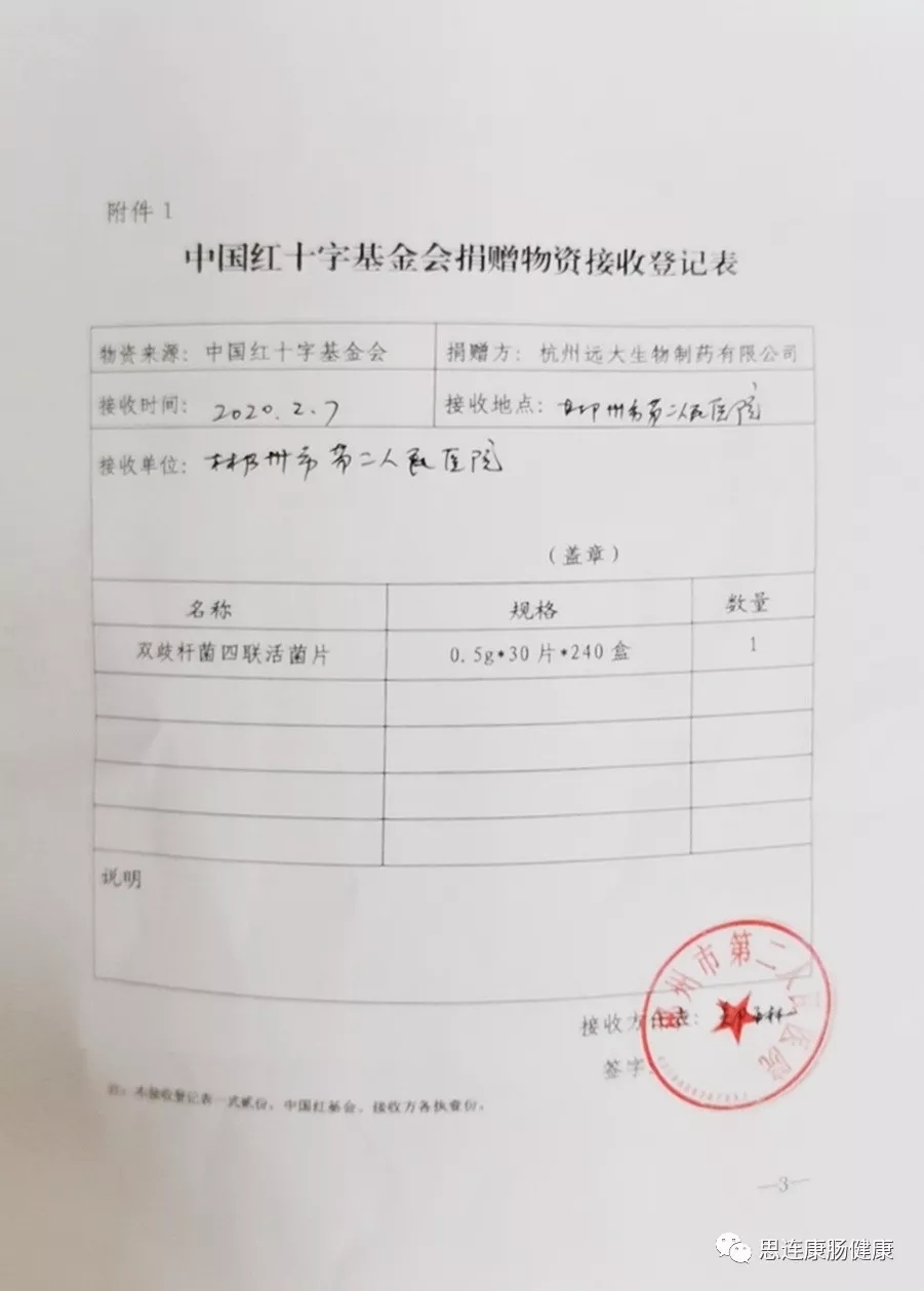 在得知防疫一線急需微生態(tài)藥品后,2020年2月6日,杭州遠(yuǎn)大生物制藥有限公司立即啟動(dòng)捐贈(zèng)程序,決定第一批捐贈(zèng)價(jià)值100萬(wàn)元的雙歧桿菌四聯(lián)活菌片(思連康),專項(xiàng)用于疫區(qū)新型冠狀病毒肺炎的防治。目前第一批價(jià)值100萬(wàn)元雙歧桿菌四聯(lián)活菌片(思連康)已全部送達(dá)湖北、浙江、湖南等地醫(yī)院;第二批價(jià)值130萬(wàn)元的思連康(雙歧桿菌四聯(lián)活菌片)也已于昨日(2月12日)開(kāi)始配送醫(yī)院。