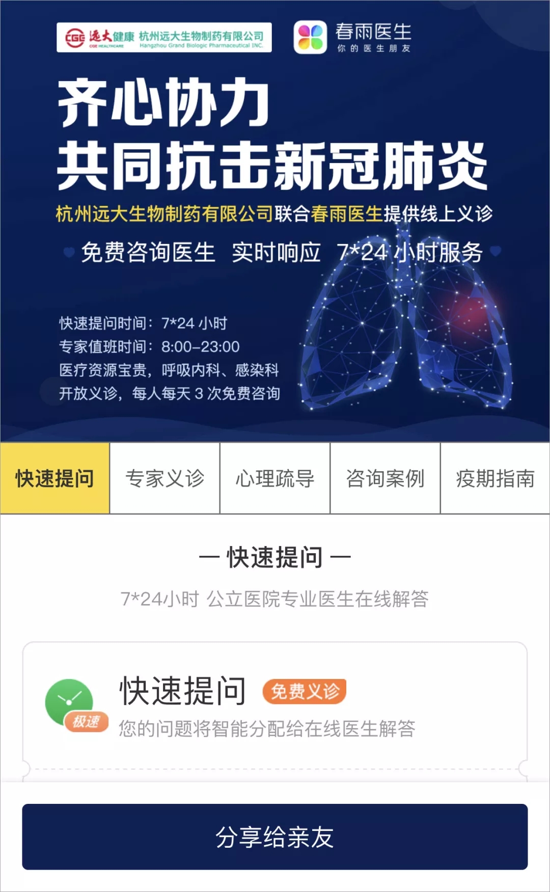 杭州遠(yuǎn)大生物制藥有限公司聯(lián)合國(guó)內(nèi)多家知名醫(yī)療在線垂直領(lǐng)域問(wèn)診平臺(tái)春雨醫(yī)生、快速問(wèn)醫(yī)生、妙手醫(yī)生共同發(fā)起免費(fèi)在線義診活動(dòng)